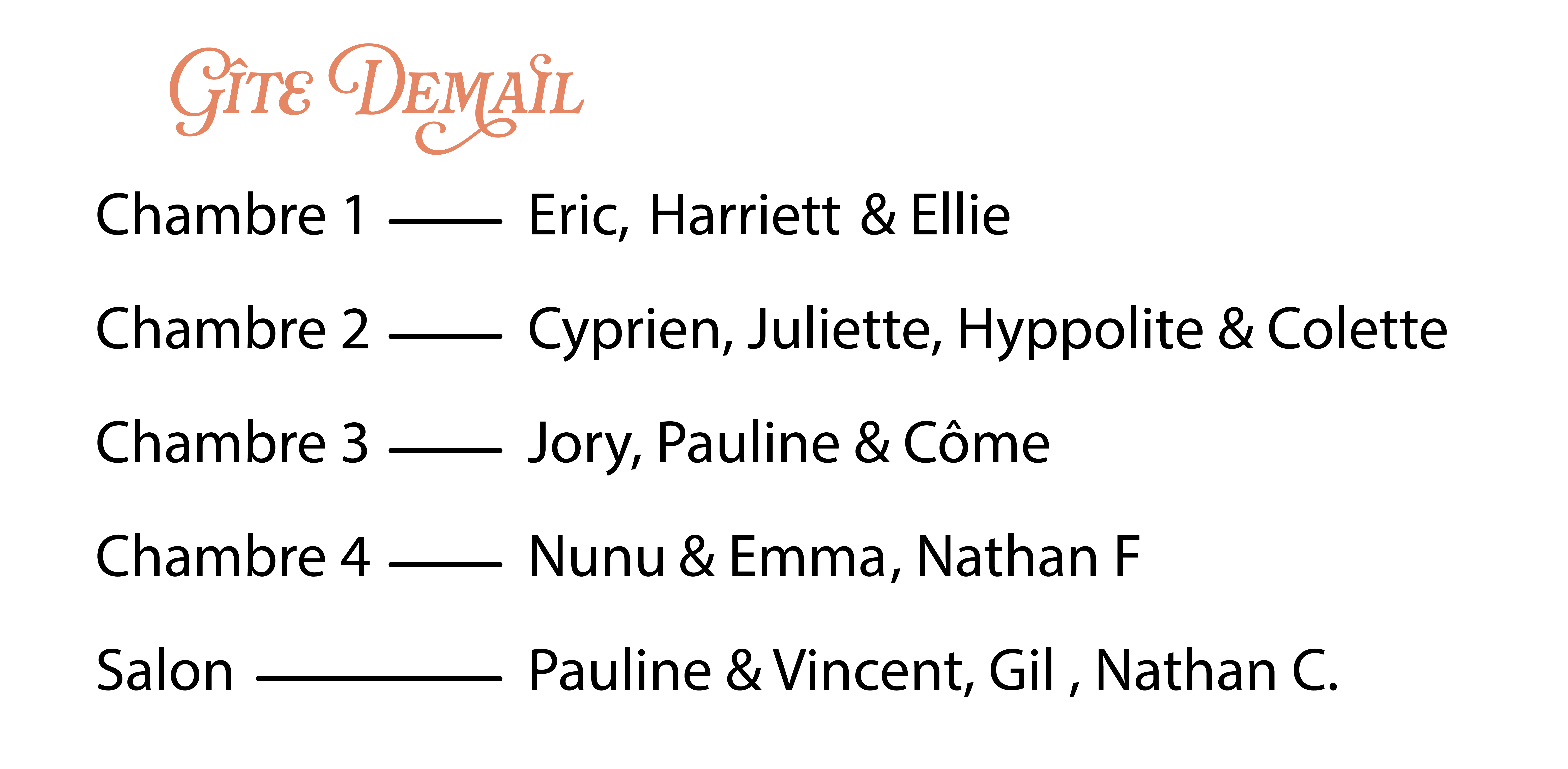 Pour tous ceux qui avaient choisi de dormir sur place au gîte, vos places ont été réservées. Aucun drap n'est à apporter, mais prévoyez vos serviettes. Les plans de chambres sont prêts, nous vous indiquerons où vous installer à votre arrivée.